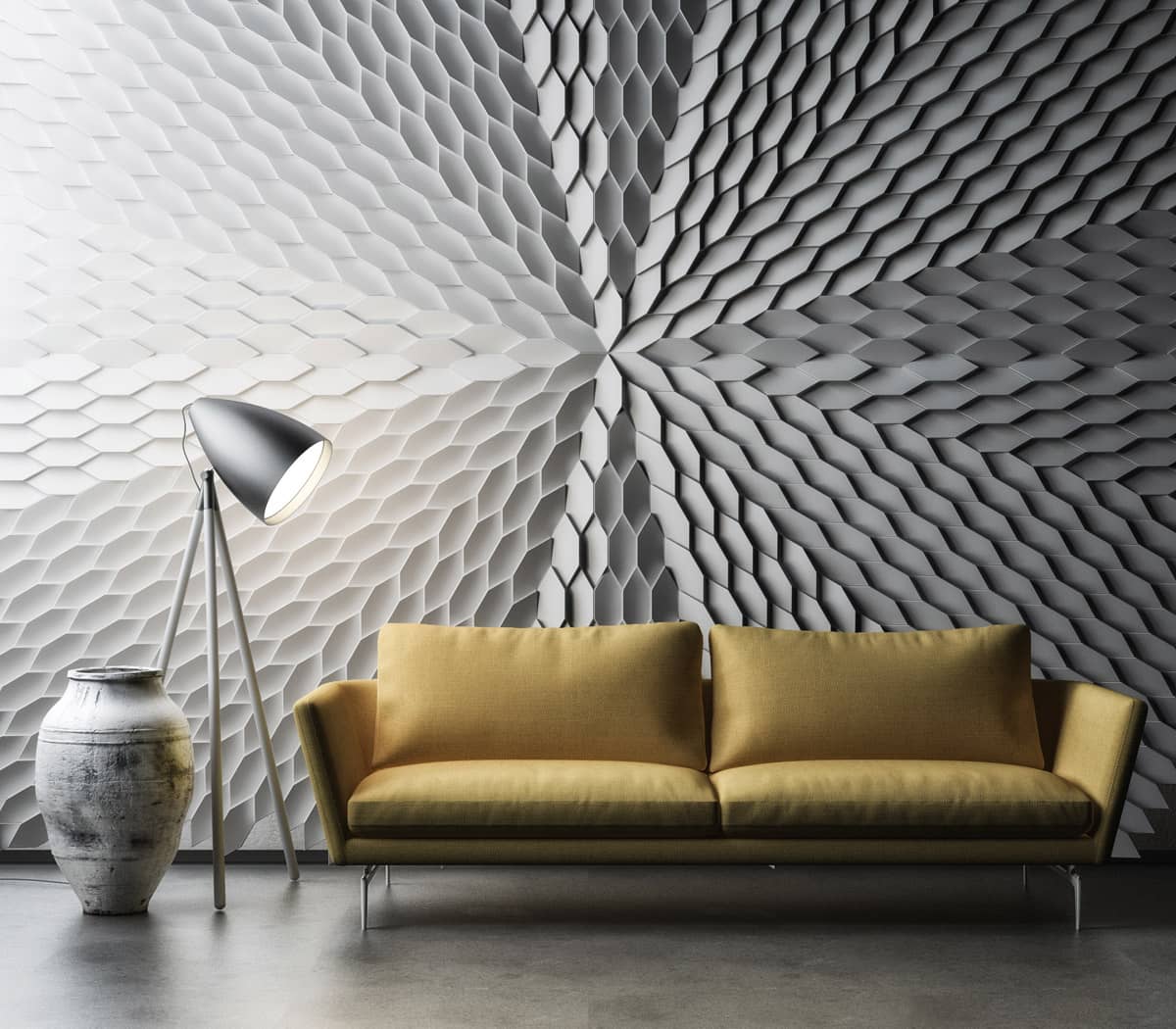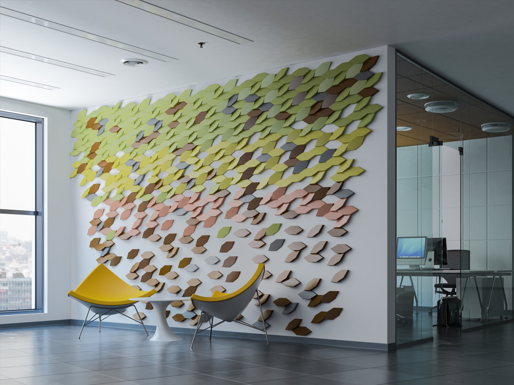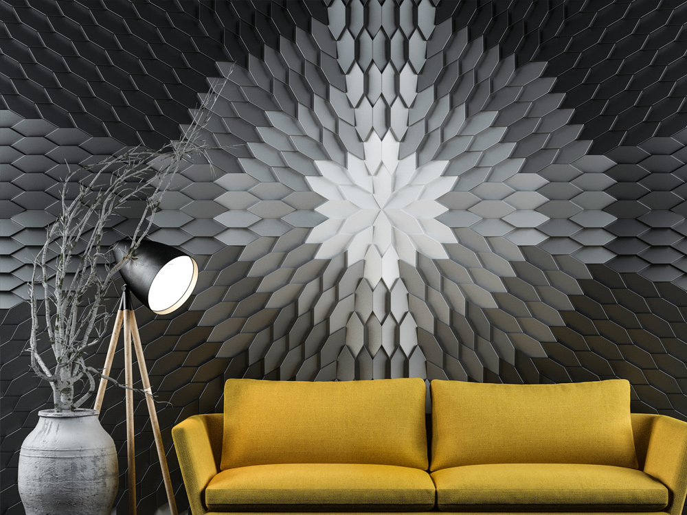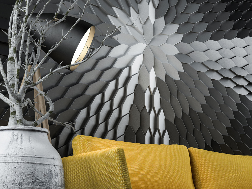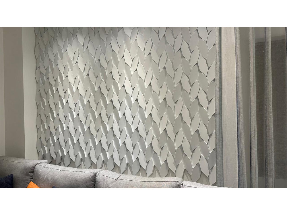Tieto malé polygonálne dlaždice v protichodných smeroch vytvárajú jemné geometrické pruhy. Dizajn dlaždíc dodáva stene pocit hĺbky vďaka hre svetla a tieňov, ktoré vytvára polygonálna geometria Mabel. Tento experimentálny dizajnový prístup založený na povrchu sa dá využiť v širokej škále kontextov a aplikácií v oblasti nástenných dekorácií. Tvar dlaždíc vytvára ilúziu farebných odtieňov prostredníctvom prirodzeného odrazu svetla.