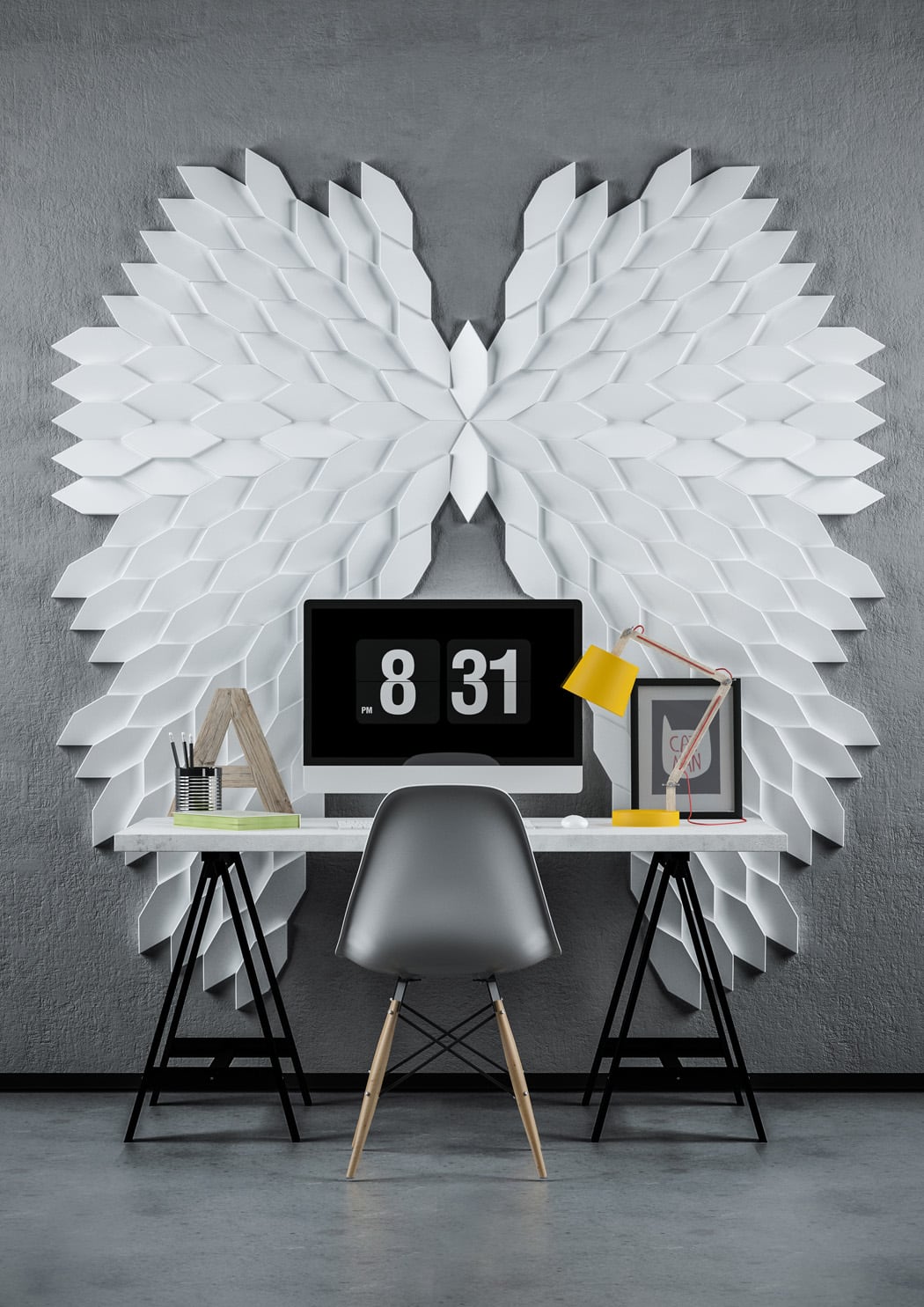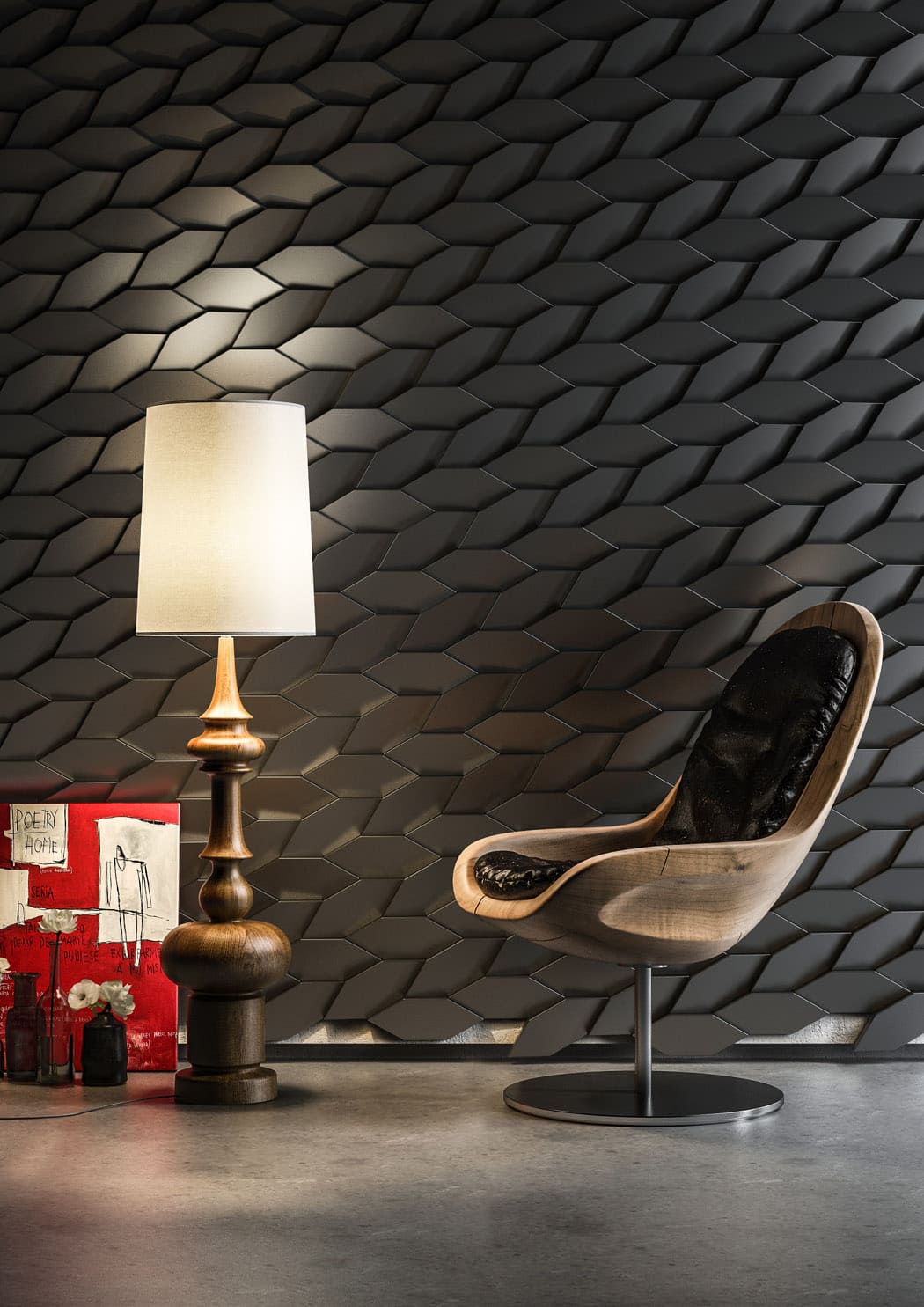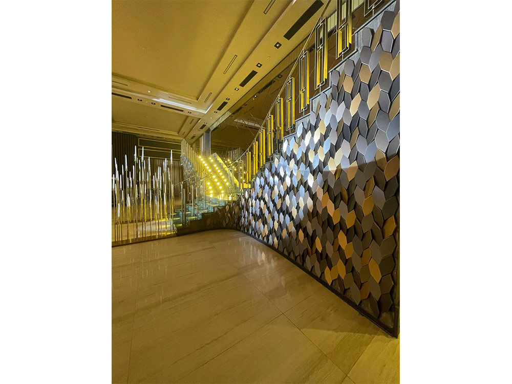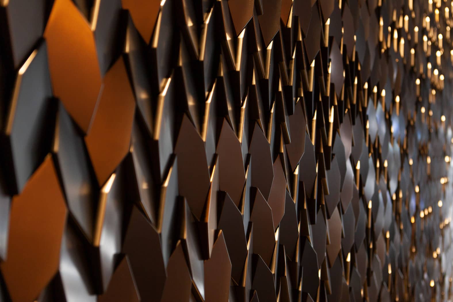 Tieto malé polygonálne dlaždice v protichodných smeroch vytvárajú jemné geometrické pruhy. Dizajn dlaždíc dodáva stene pocit hĺbky vďaka hre svetla a tieňov, ktoré vytvára polygonálna geometria Mabel. Tento experimentálny dizajnový prístup založený na povrchu sa dá využiť v širokej škále kontextov a aplikácií v oblasti nástenných dekorácií. Tvar dlaždíc vytvára ilúziu farebných odtieňov prostredníctvom prirodzeného odrazu svetla.