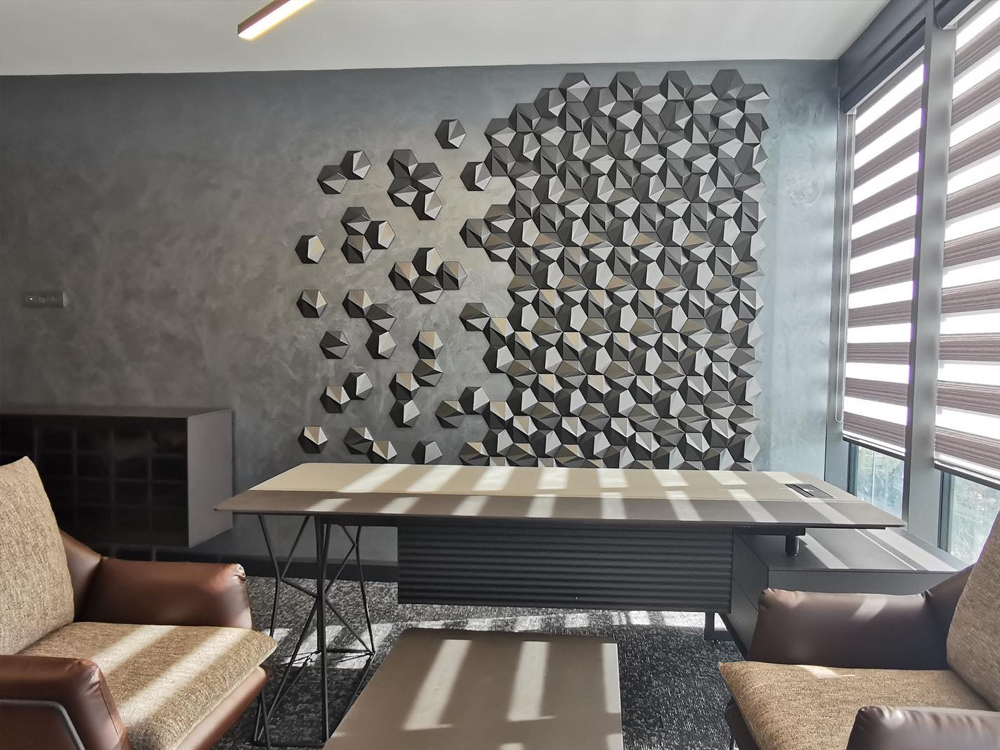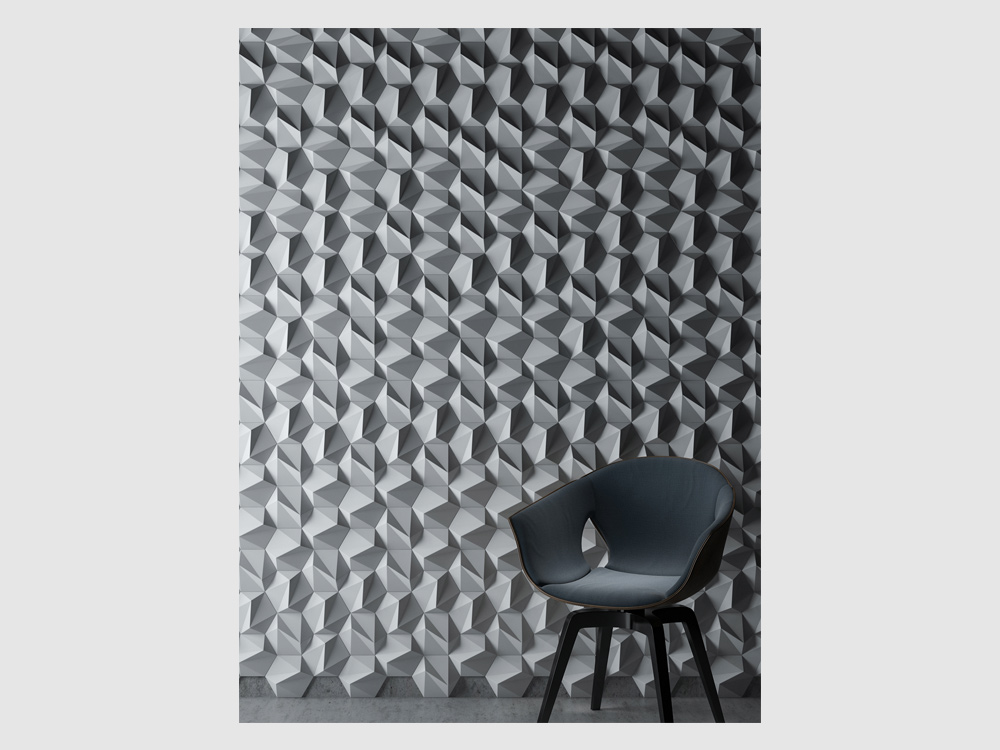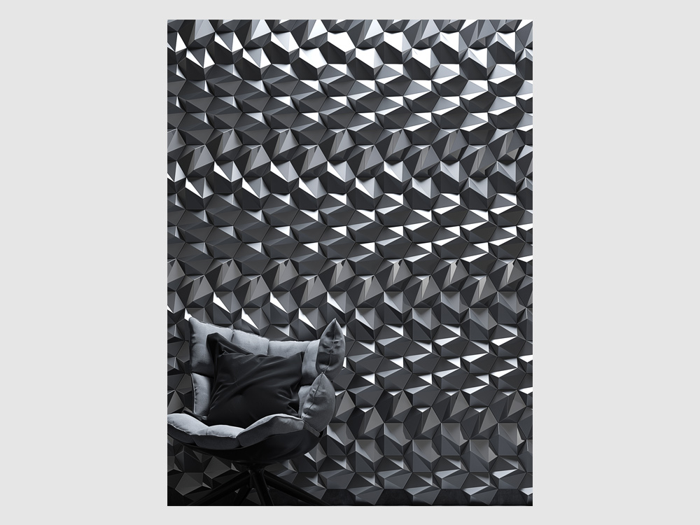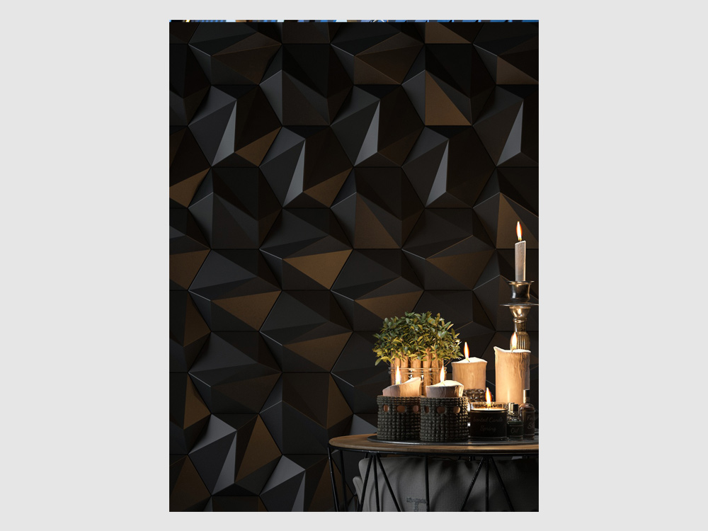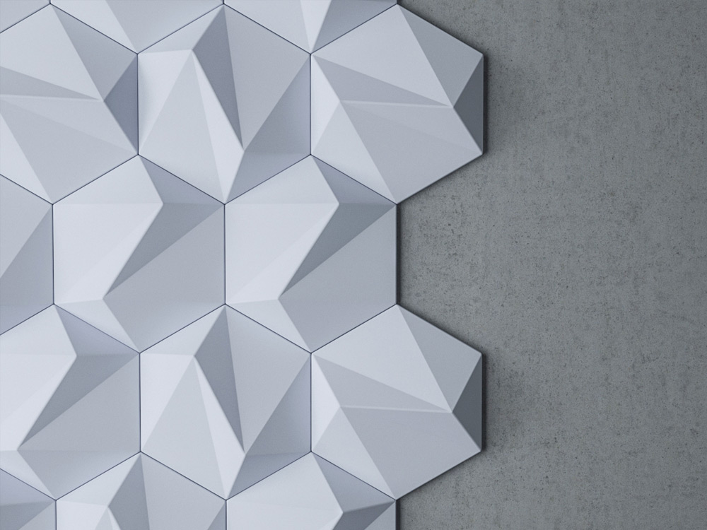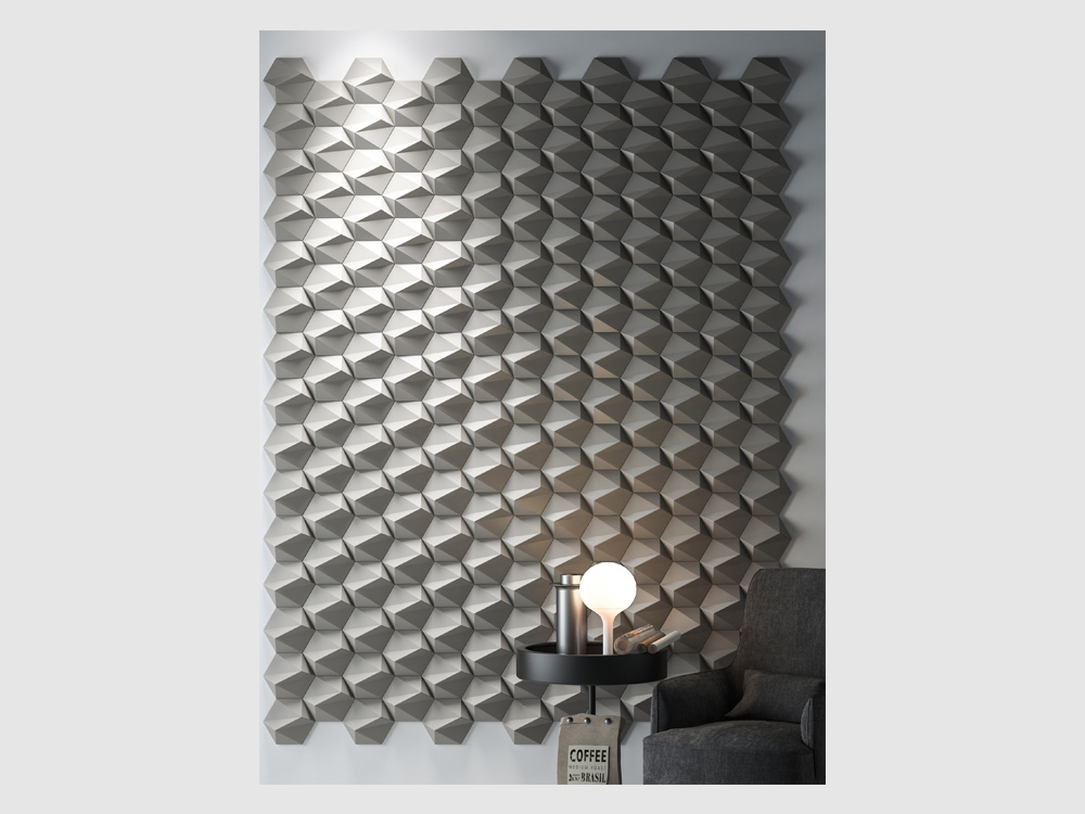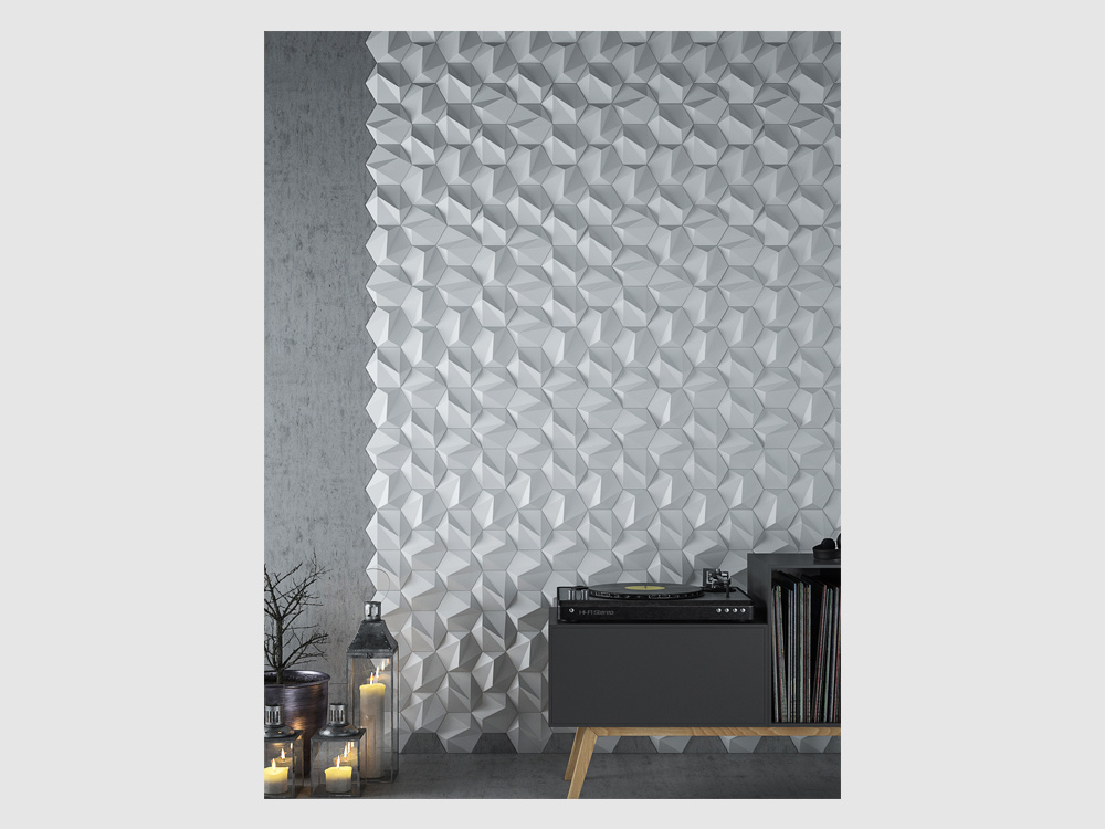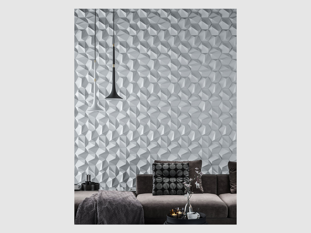 S trojrozmernými šesťuholníkovými dlaždicami je „ZETA“ elegantnou verziou vzoru vo forme včelieho plástu, ktorý je k dispozícii v lesklom aj matnom vyhotovení, ako aj v rôznych farbách. Ich uhlové plochy vytvárajú jemné odtiene a môžu byť usporiadané tak, aby vytvárali subtílne obrazy a grafiku. 3D nástenná dekorácia ZETA vytvára realistický trojrozmerný pohľad vďaka svojim symetrickým ostrým líniám. Tí, ktorí hľadajú moderný romantický nádych vo svojich interiéroch, budú ohromení polygonálnou geometriou ZETA. Vizuálna poézia nenápadných odtieňov pôsobí upokojujúco, keď sa prirodzené svetlo jemne odráža od 3D nástennej dekorácie.
